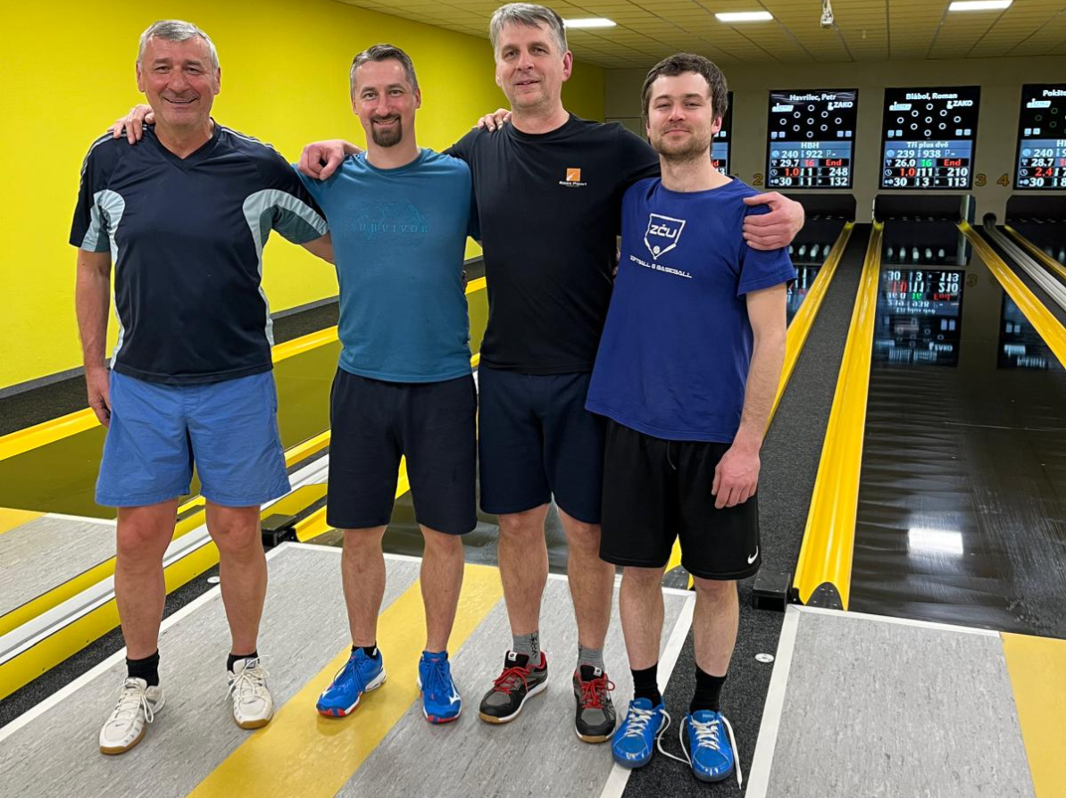 V posledním dnešním utkání přivítali hráči HBH tým Tři plus dva (na snímku). První čtveřice přinesla nečekaný výsledek, když ne zcela kompletní domácí na svého soupeře vůbec nestačili o čemž svědčí průběžný stav 0:2 a manko 48 kuželek. Ani za tohoto krajně nepříznivého stavu domácí nesložili zbraně a v polovině druhé části snížili ztrátu na polovinu. Víc už jim hosté nedovolili a tým Tři plus dva si připisuje velice cenné dva body, které je katapultují do elitní trojky.